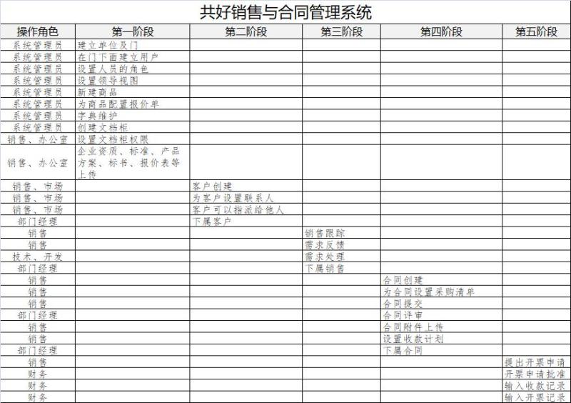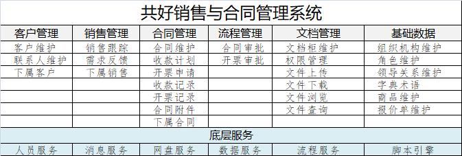 共好合同管理系統(tǒng)包括:客戶維護(hù)、銷售跟蹤管理、客戶需求管理、合同管理、流程評審、企業(yè)文檔管理、企業(yè)即時(shí)通訊平臺等模塊組成
