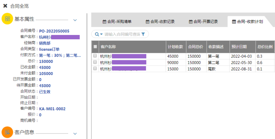 能對合同全局進(jìn)行查看(如 采購清單、收款記錄、開票記錄、收款計(jì)劃等)